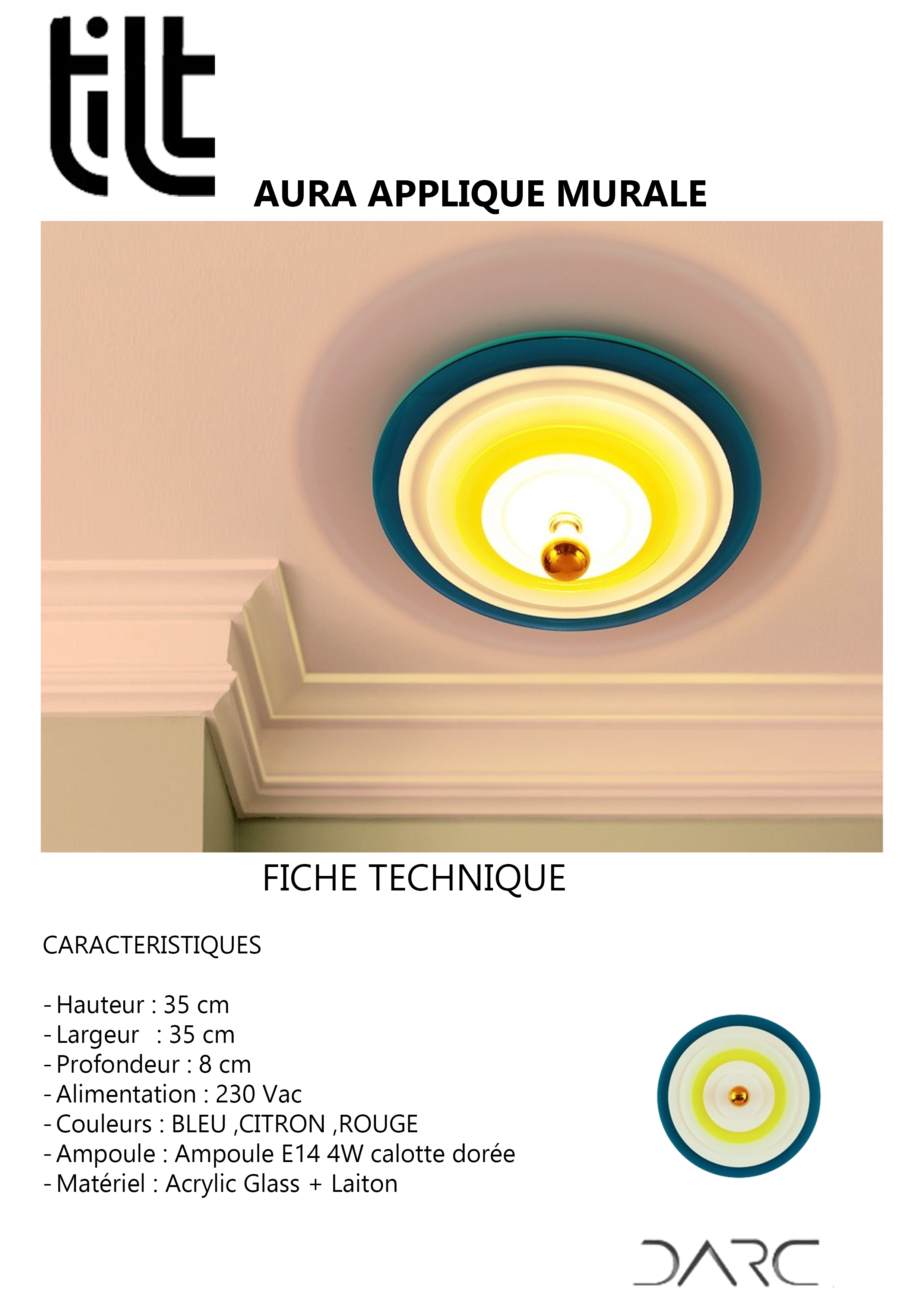 Jouant avec les finitions lumineuses, la lampe applique ou plafonnier AURA aux couleurs BLUE CITRUS offre une subtile variation de couleurs selon l’angle de vue, créant ainsi un objet lumineux ludique qui allie fonctionnalité et poésie. L’ampoule dorée réfléchit délicatement la lumière sur le mur, mettant en valeur des jeux de formes colorées et d’ombres subtils. AURA sait se présenter de manière imposante, que ce soit par sa palette colorée ou sa géométrie, tout en pouvant également se fondre délicatement derrière les effets visuels qu’elle génère.