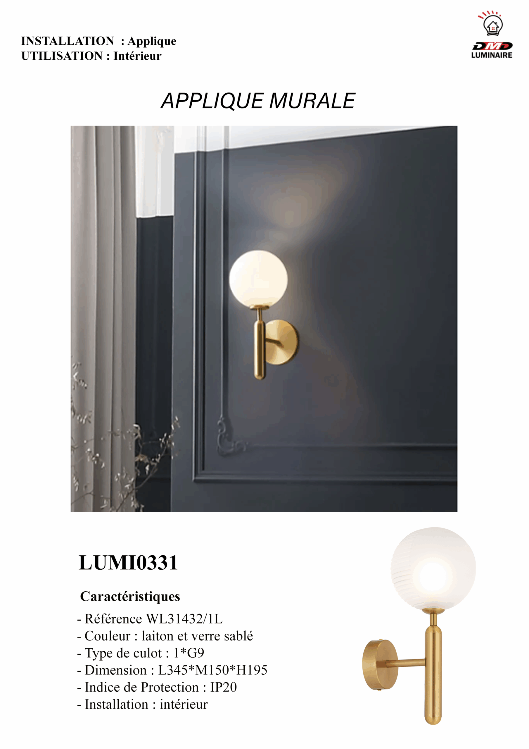 – Couleur : laiton et verre sablé