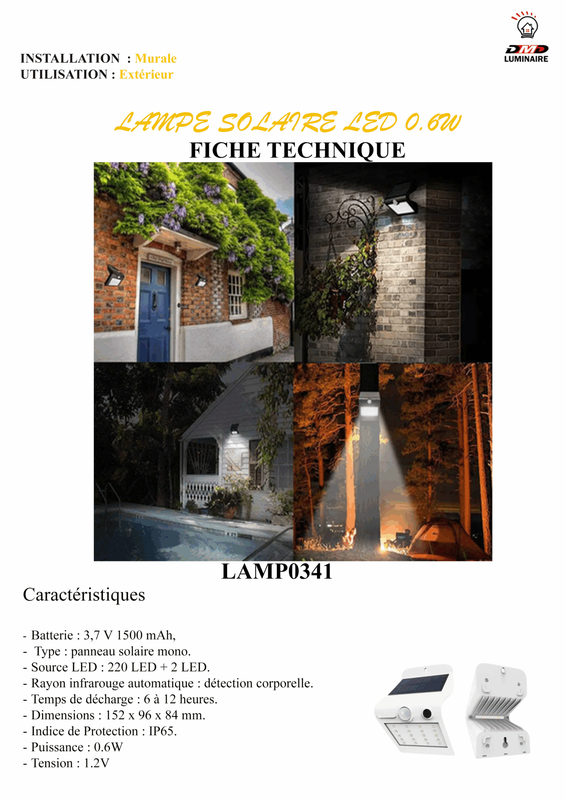 LAMPE SOLAIRE MURALE LED1.2V 15,2 x 9,6 x 8,4cm REF DME02231