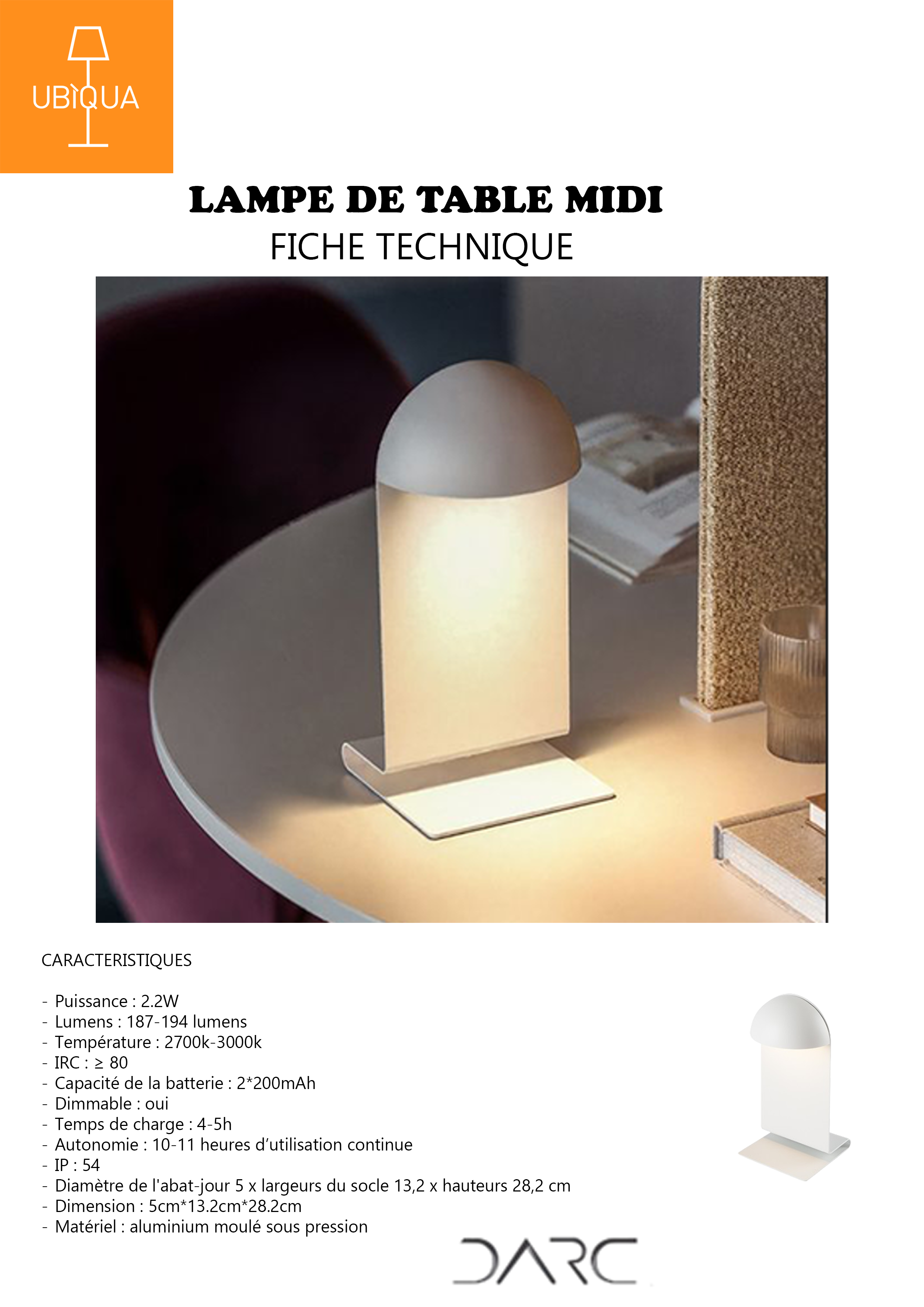 MIDI d’Ubiqua Lighting est une lampe LED rechargeable conçue pour une utilisation polyvalente, aussi bien en intérieur qu’en extérieur.
