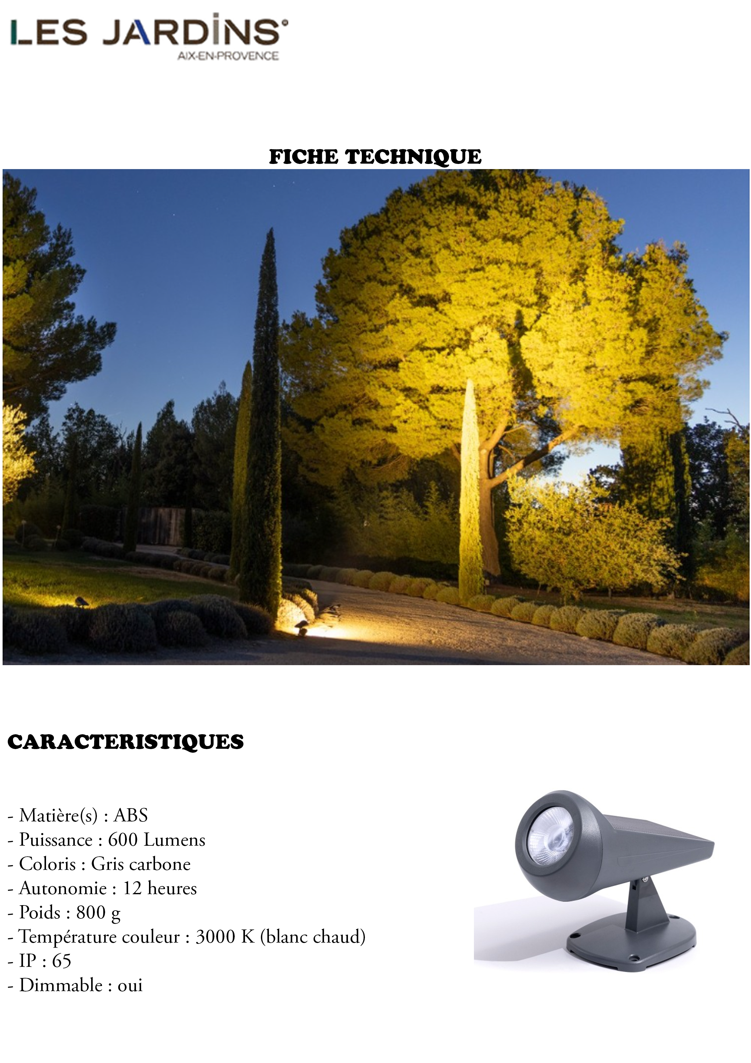 OJE SPOT SOLAIRE : Le spot solaire intelligent développé par la marque française Les Jardins est puissant et dispose d’une grande autonomie. Un seul bouton pour 3 modes de fonctionnement : le mode intelligent : réglage automatique de l’intensité, le mode crépusculaire : réglable de 10 à 600 Lumens et le mode marche forcée : réglable de 10 à 600 Lumens.