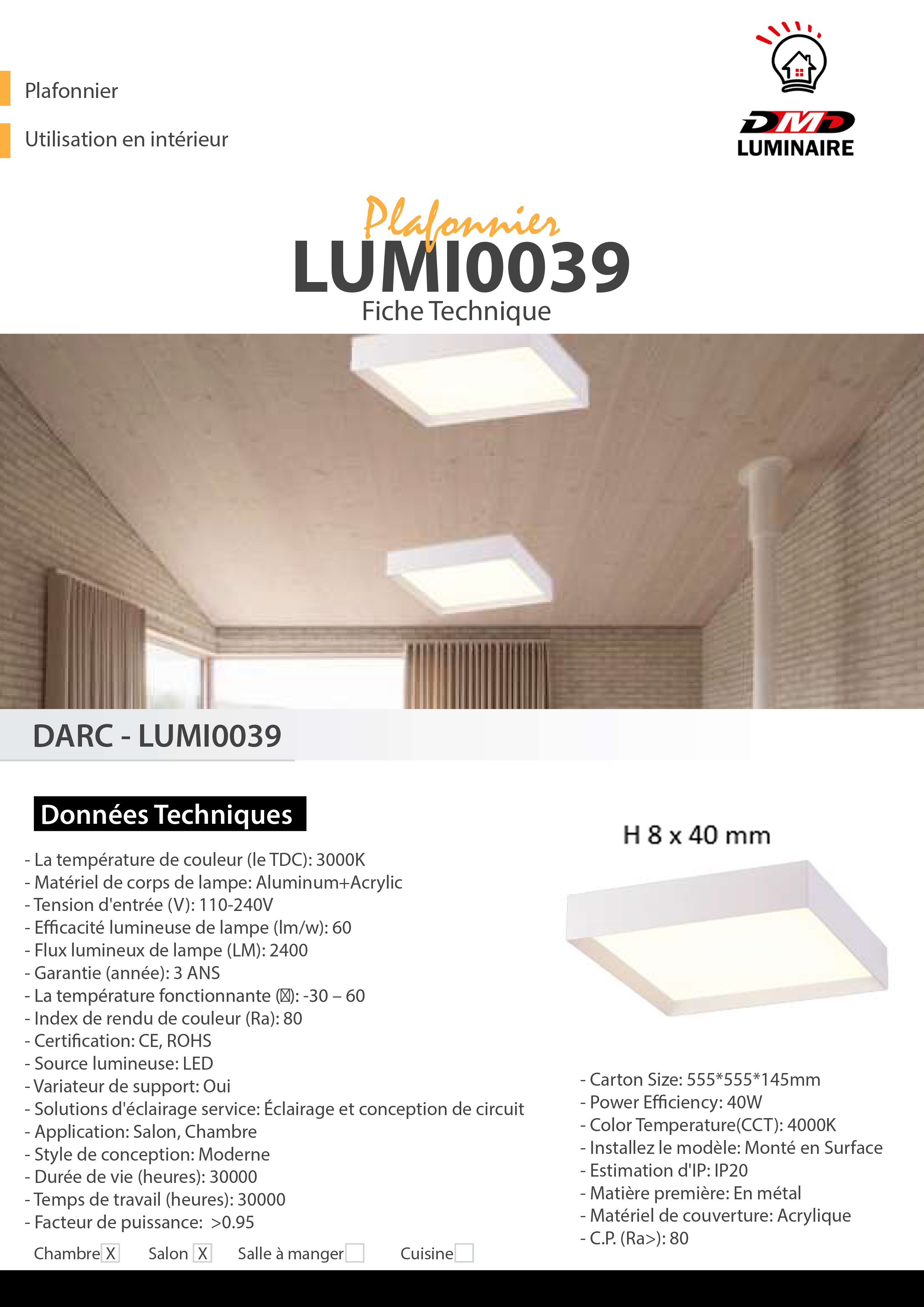 – Efficacité lumineuse de lampe (lm/w): 60
