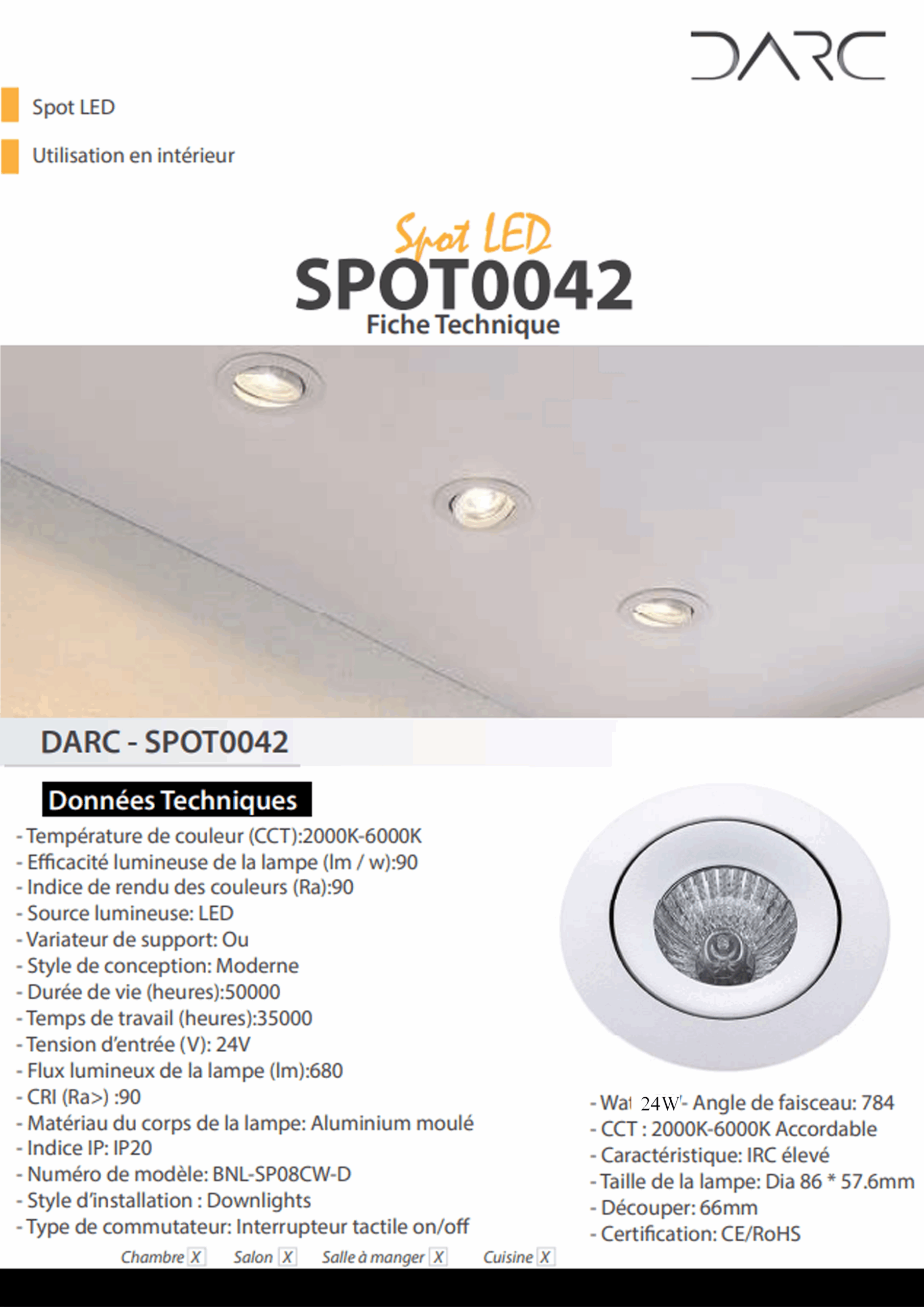 – Style d’installation : Lumière descendante