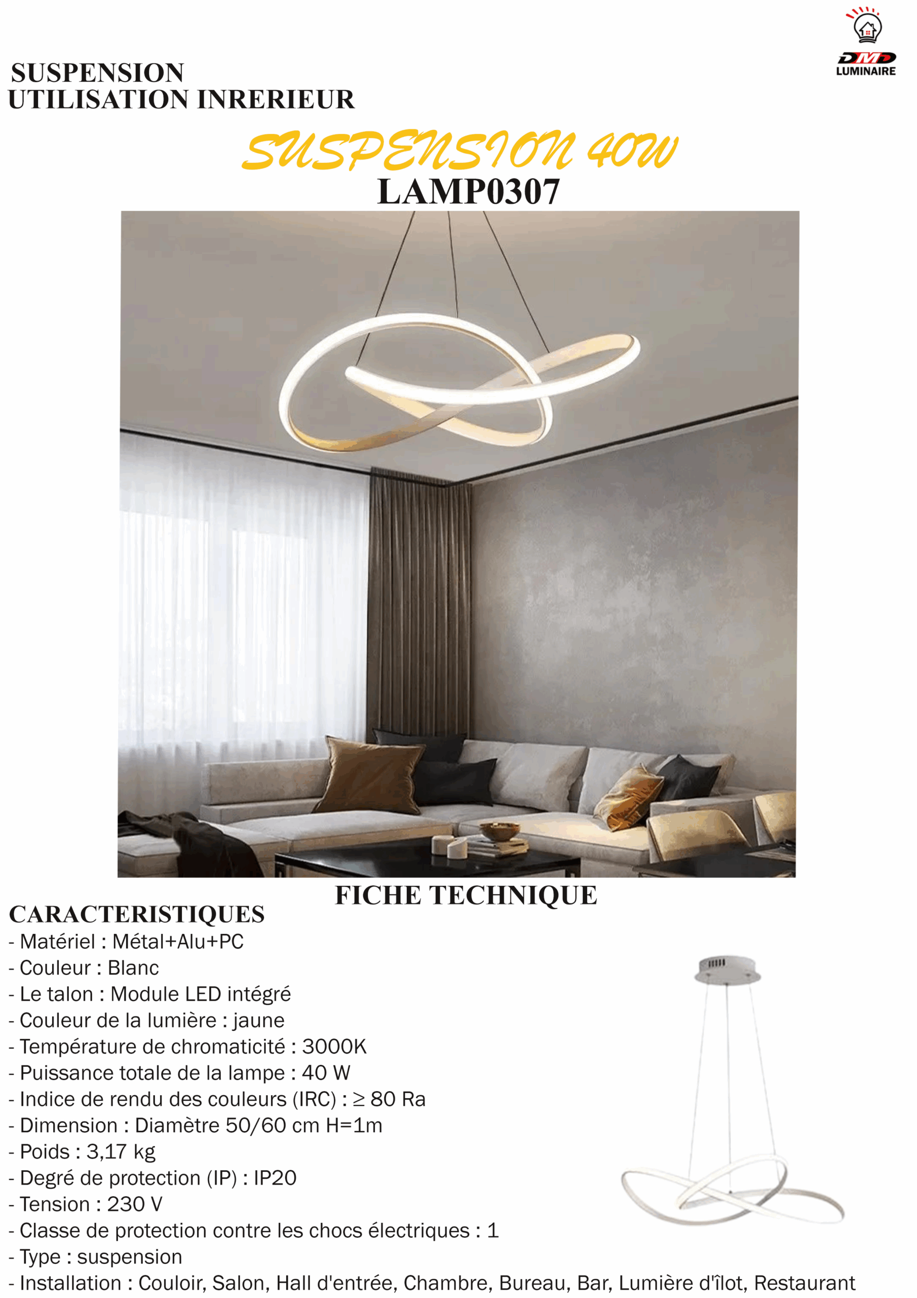 – Installation : Couloir, Salon, Hall d’entrée, Chambre, Bureau, Bar, Lumière d’îlot, Restaurant