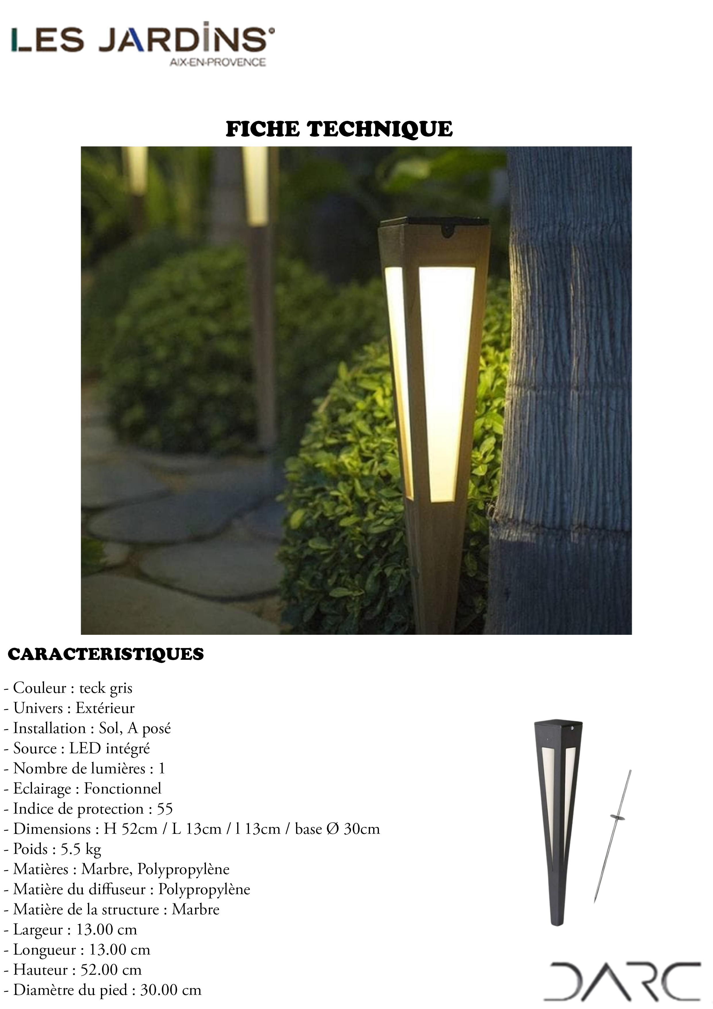 – Dimensions : H 52cm / L 13cm / l 13cm / base Ø 30cm