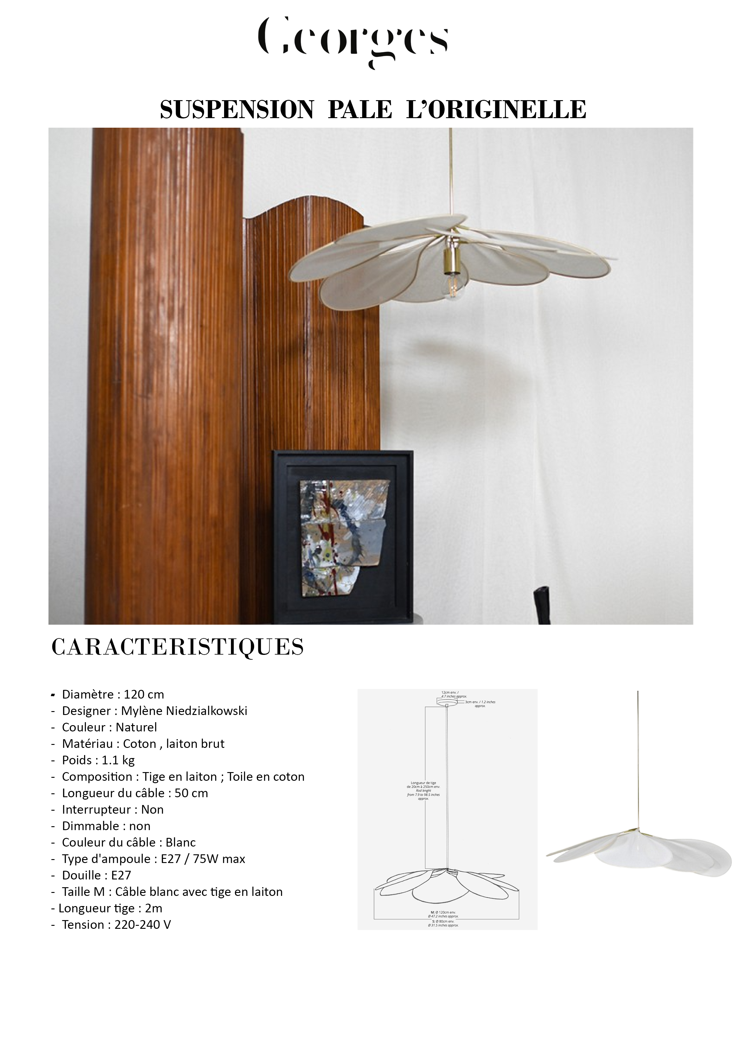 Tous les éléments de cette suspension sont fabriqués ou usinés dans notre atelier Béarnais. Chaque pétale est entièrement fait à la main à partir d’une tige en rotin sur laquelle est tendue une toile à beurre de coton peinte (toujours dans nos atelier) avec un mélange de pigments naturels. Les pièces en laiton sont également usinées dans notre atelier. Pale ajoute un hommage aux ventilateurs de plafond rétro des chambres à persiennes. Cette suspension joue subtilement avec la lumière, diffusant une clarté douce dans la pièce et des jeux d’ombres délicats au plafond.