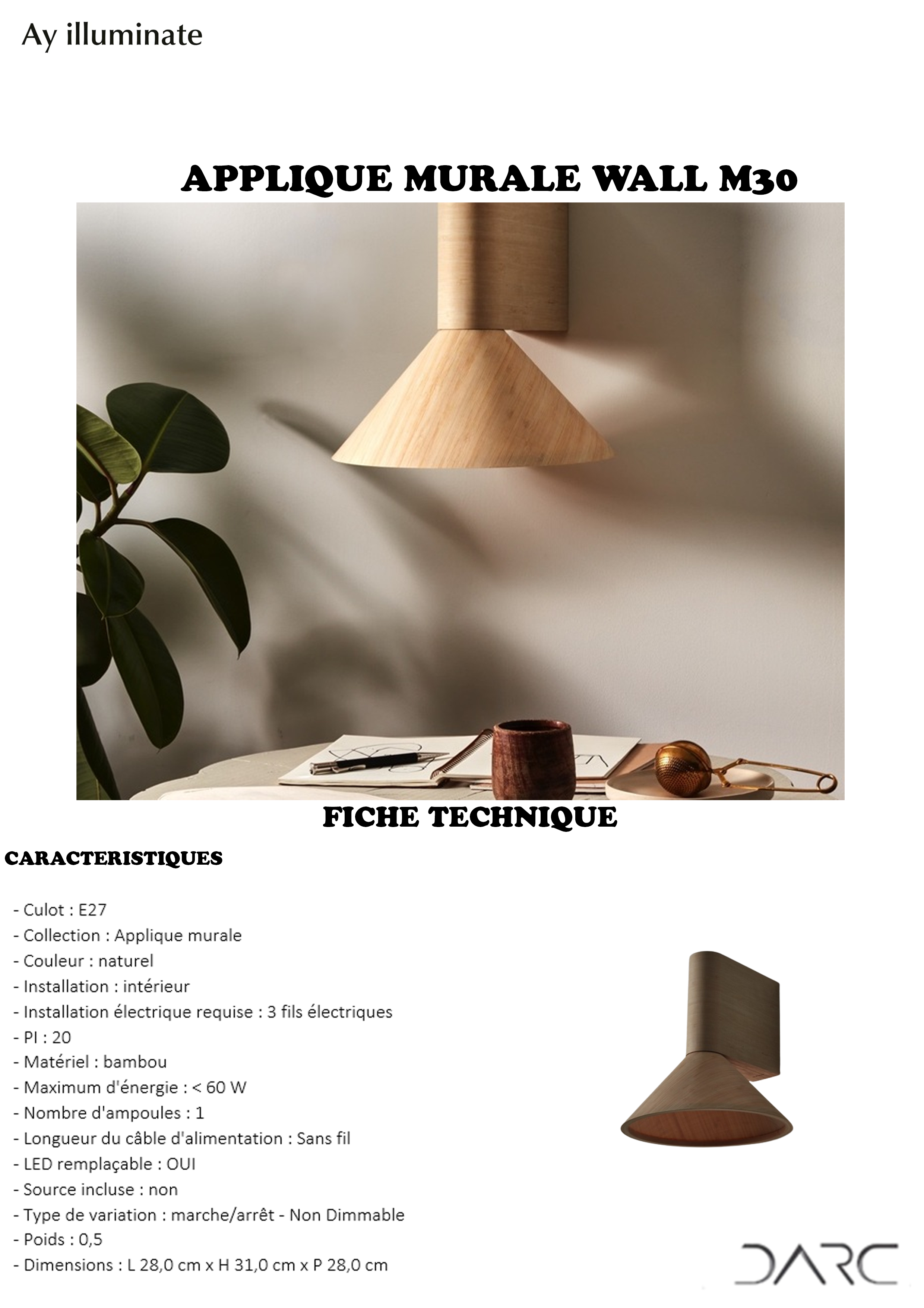 L’attrait esthétique de l’applique Wall M30 réside dans son utilisation délicate du bambou, un matériau choisi pour sa durabilité et son charme naturel. Sa couleur naturelle et sa forme conique apportent une touche organique à l’espace, créant une atmosphère chaleureuse et apaisante.