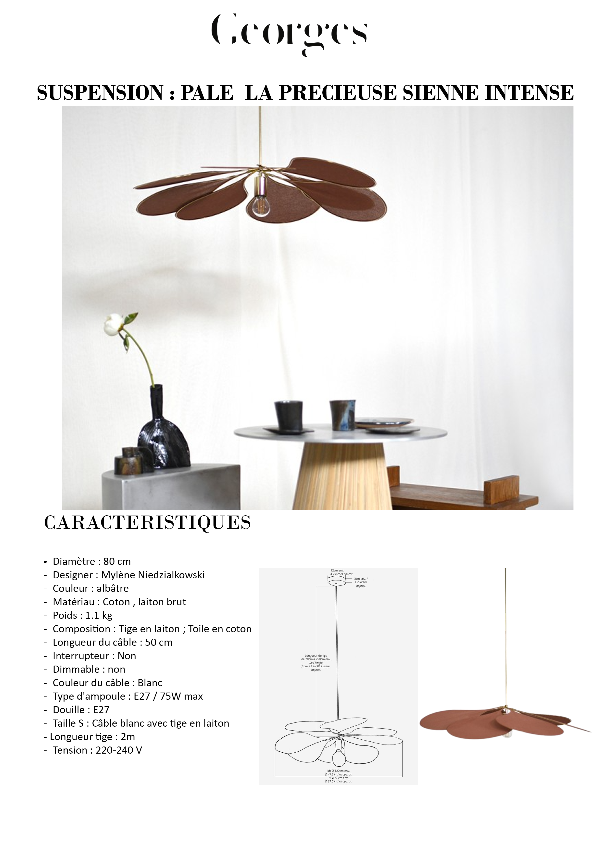 La suspension Pale précieuse est fabriquée au chateau de Méritein, notre manufacture béarnaise. Chaque pétale est entièrement fait à la main à partir d’un arceau de laiton sur lequel est tendue une toile à beurre de coton peinte à la main avec un mélange de pigments naturels. Tous les éléments de la suspension Pale précieuse sont sourcés en France.