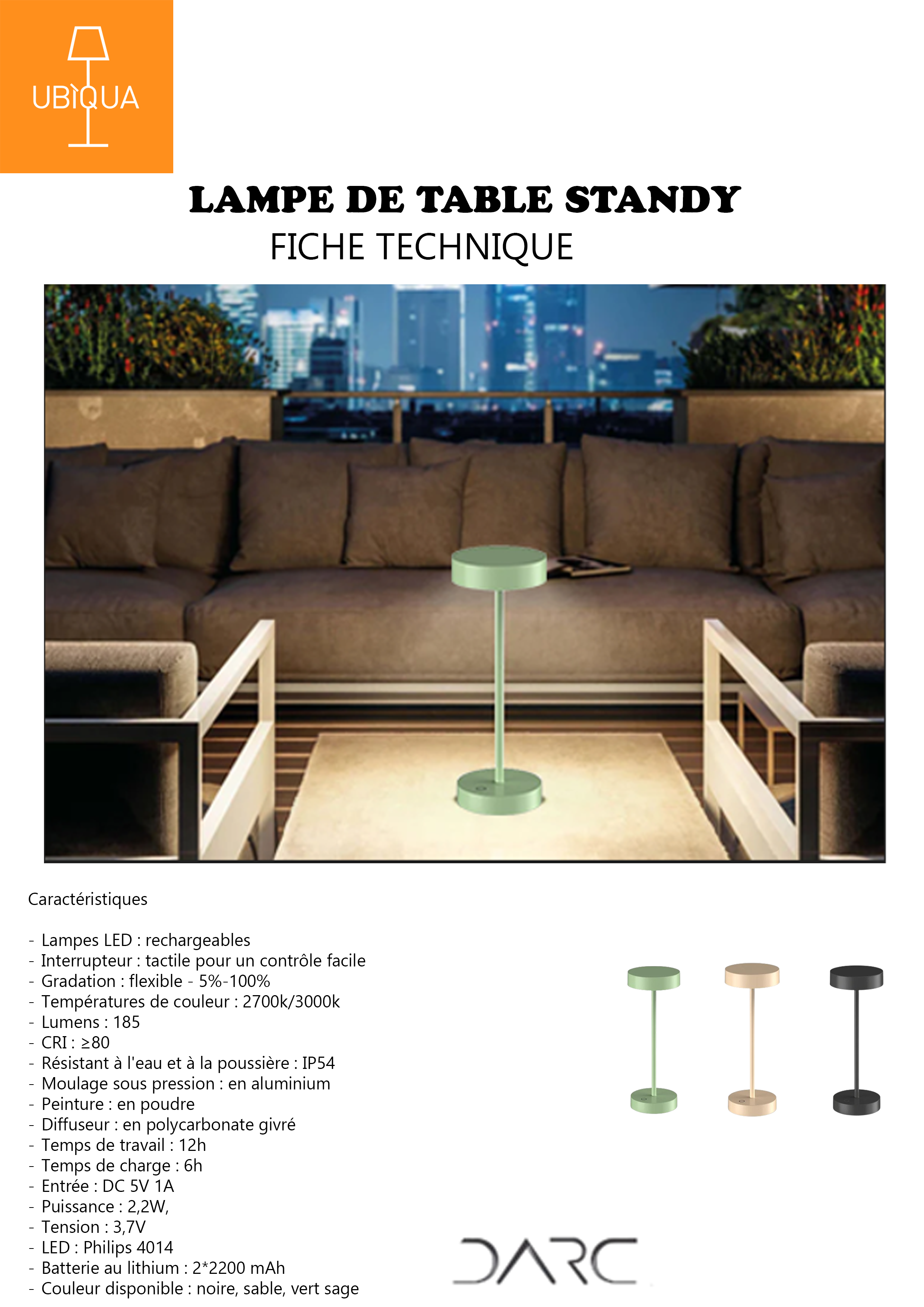 La lampe STANDY a un design épuré et moderne, avec une base circulaire, une tige fine et un abat-jour circulaire. Elle est disponible sous trois couleurs sable, noire et vert sage ce qui lui donne un aspect élégant et neutre, adapté à différents styles de décoration intérieure. Conçue pour résister à la poussière, elle assure une performance constante et réduit la nécessité de nettoyage fréquent.
